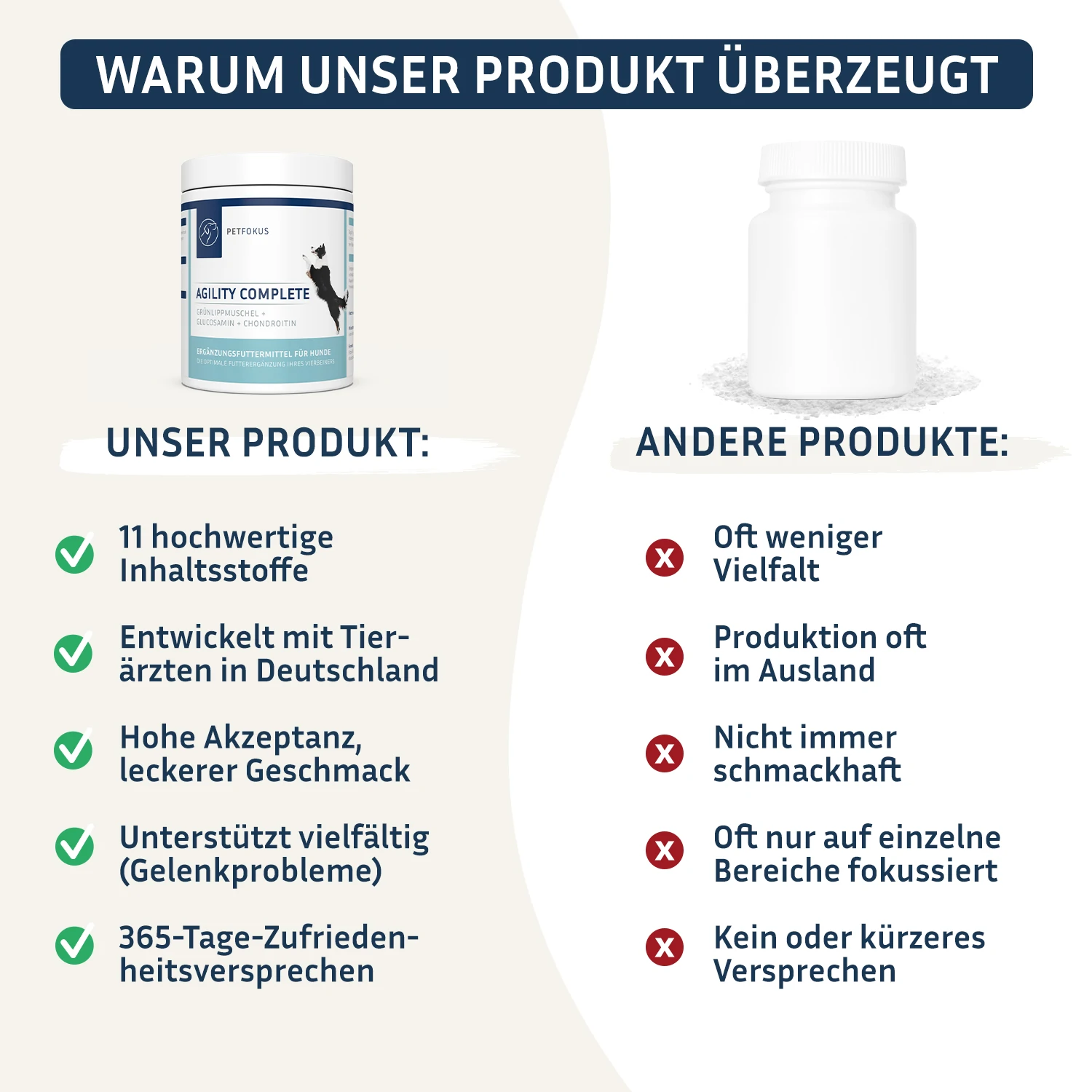 Des Weiteren ist PetFokus Agility Complete mit Tierärzten in Deutschland entwickelt worden und wird auch ausschließlich in Deutschland hergestellt. Es weist ein hervorragendes Preis-Leistungs-Verhältnis auf.