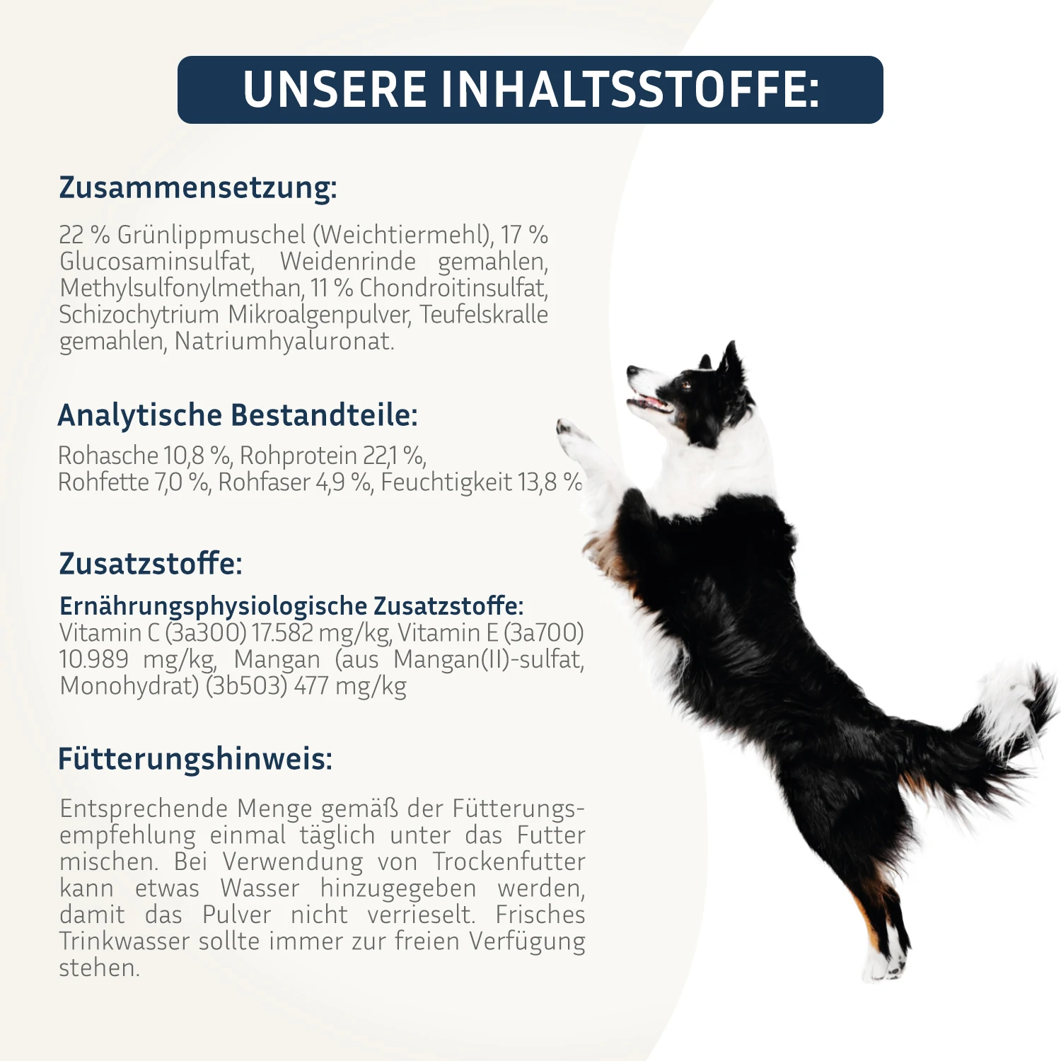 Zusammensetzung: 22 % Grünlippmuschel (Weichtiermehl), 17 % Glucosaminsulfat, Weidenrinde gemahlen, Methylsulfonylmethan, 11 % Chondroitinsulfat, Schizochytrium Mikroalgenpulver, Teufelskralle gemahlen, Natriumhyaluronat.