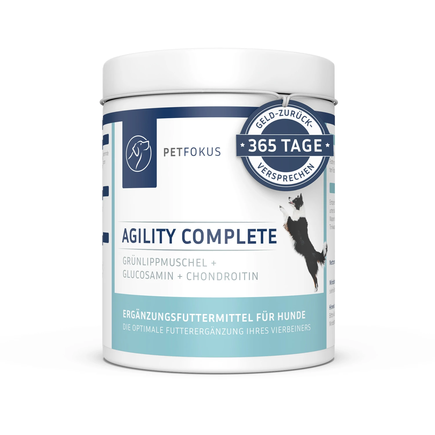 Sollten Sie mit PetFokus Agility Complete nicht zufrieden sein, können Sie unsere 365-Tage-Geld-zurück-Garantie nutzen und uns ungeöffnete Dosen bis zu einem Jahr nach Ihrer Bestellung zurücksenden. Sie erhalten dann von uns eine vollständige Rückerstattung Ihres Kaufpreises. Dies gilt auch für den unwahrscheinlichen Fall, dass Ihr Hund die Aufnahme des Pulvers über seinem gewohnten Futter verweigert.